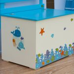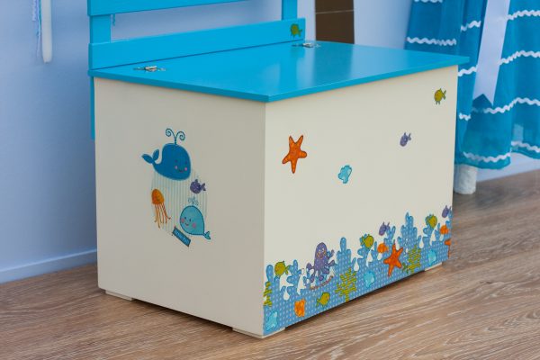 Ξύλινο παγκάκι (MDF) με θέμα τον βυθό. Μετά την βάπτιση χρησιμεύει σαν καθισματάκι για το παιδί με αποθηκευτικό χώρο για τα παιχνίδια του. Διακοσμημένο με την τεχνική του decoupage και άλλες τεχνικές. Χρώματα: ζαχαρί-γαλάζιο.