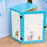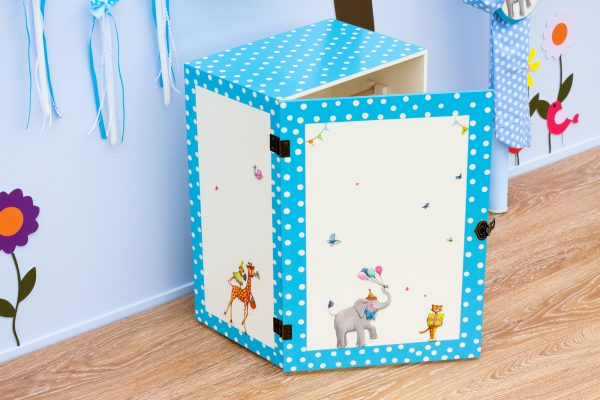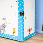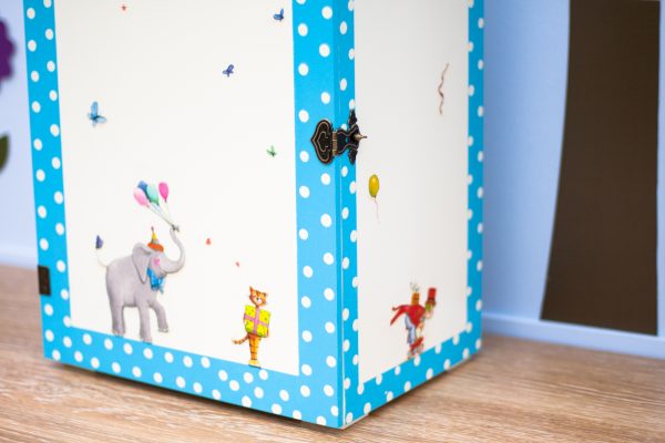 Ξύλινη πουά ντουλάπα (MDF) με ζωάκια και ζογκλέρ. Μετά την βάπτιση, το παιδί μπορεί να την χρησιμοποιήσει για να αποθηκεύσει ρούχα ή παιχνίδια. Διακοσμημένο με την τεχνική του decoupage και άλλες τεχνικές. Χρώμα: ζαχαρί-γαλάζιο.